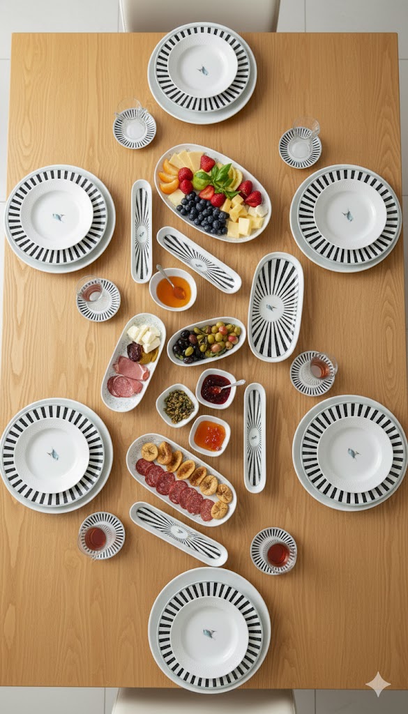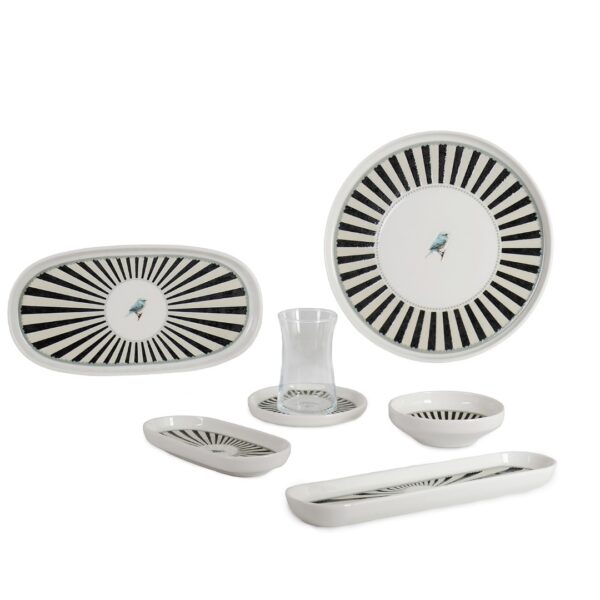 29 parça set içeriği ile tüm kahvaltı ihtiyaçlarınız tek bir pakette karşılanır. Toplamda 29 parçadan oluşan set, aile yemeklerinden özel davetlere kadar her türlü ortama uyum sağlar. Set içeriği: 6 Adet 24 cm servis tabağı 6 Adet çay tabağı 6 Adet cam çay bardağı 3 Adet 22 cm kayık sunum tabağı 4 Adet 10 cm mini kase 2 Adet zeytinlik 2 Adet mini kayık tabak