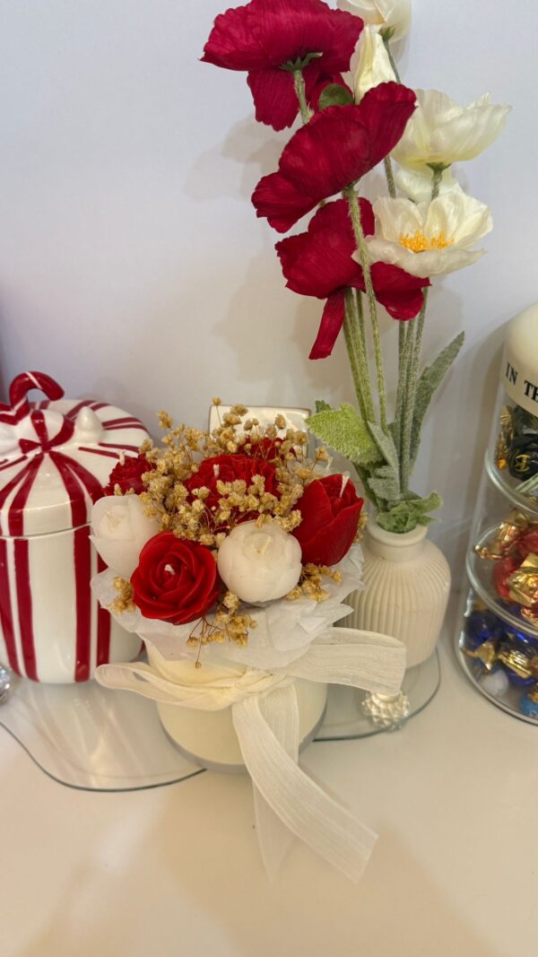 Gül şeklinde ki mumlardan oluşan çiçek buketi.